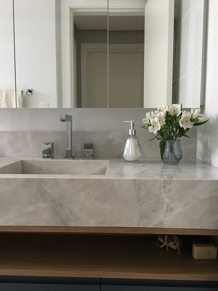 Harmonia entre revestimentos, marcenaria e metais sanitários escolhidos para os banheiros são destaque no projeto assinado por Clarissa Zanatta
