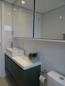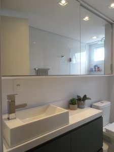 Já na suíte do casal, de 3,65 m², foi utilizada marcenaria verde oliva em contraste com a bancada de porcelanato branco e cuba de louça branca. O box utilizado foi o de giro, sem perfis superiores, para buscar um ambiente mais limpo, por se tratar de um banheiro estreito. O espelho foi feito com portas de correr com perfil em toda a extensão até o box, aproveitando o espaço existente e garantindo sensação de amplitude. Neste cômodo os metais também são da Meber: Quadra para o monocomando de bancada e acessórios; Gioia para ducha com flexível. “Os itens foram escolhidos de acordo com a percepção e uso das pessoas: um investimento maior nas torneiras, porque é o item de maior destaque no banheiro, além de priorizar acessórios de uma linha bonita no banheiro social e ducha com flexível no banheiro da suíte” assinala Clarissa.