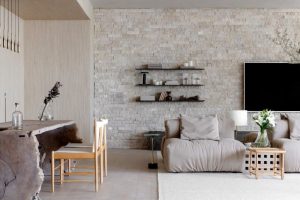 Para composição do espaço a profissional optou por elementos naturais, como o algodão, pedras e a madeira. A arquiteta explica que a escolha de materiais e acabamentos foi fundamental para garantir o conforto do ambiente, trazendo o toque suave, a sensação de calor e até mesmo um aroma característico da madeira, transformando a experiência sensorial do espaço. Com uma paleta neutra que preserva contraste e texturas, a integração da paisagem exuberante com a composição interna firma uma conexão entre cores e formas: a parede de pedra Rock Face em Travertino Mattone da Ritallio, um pórtico em MDF lançamento da Arauco, na cor Maraú, além do mármore natural Cerrado Pavimento que delimita a área da varanda.