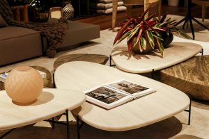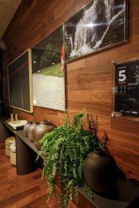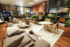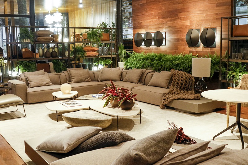 Como resultado, conforto visual, amplitude e harmonia de cores expressas em cada detalhe do ambiente. Cores neutras, madeira natural escura, acabamento em couro, metais e linho. No piso e nas paredes, a madeira natural Nogueira foi utilizada destacando os objetos e as peças da loja. Entre os móveis do espaço estão o aparador Rio, a estante Tornai, o banco Marotay, a mesa de chá Rongi, a mesa de centro Pandia, a mesa componível Paloh, a mesa de centro Boracay, a mesa lateral Branti, o módulo de sofá Kadan, a poltrona Kendari e a poltrona Palawan.