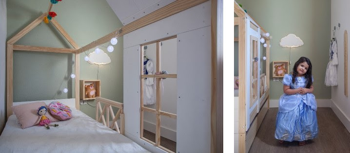 Eles também já pensaram na utilização para o futuro. “Ao incluir uma cama de solteiro em tamanho normal, ao invés de uma menor, já possibilitamos o seu uso quando ela estiver maior – só será necessário retirar a parede de casinha. Há também uma bicama inclusa, para Maria Clara levar as amiguinhas em casa quando estiver maior”, explica Bruno.