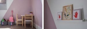 Mesmo com o tempo apertado, Bruno fez questão de criar um ambiente sensorial e educativo para a criança, com inspiração no modelo de decoração montessoriana. E assim, o ambiente ganhou cama e armário em forma de casinha, além de uma simpática mesinha para que ela pudesse interagir com o ambiente e desenvolver tudo isso em sua memória. Junto à mesa, há uma cadeira pequena e outra maior, para que a mãe possa ajudá-la nas tarefas.