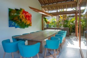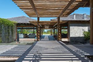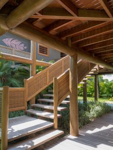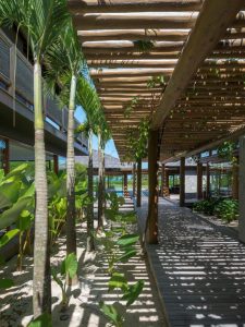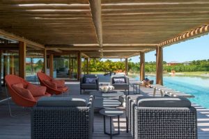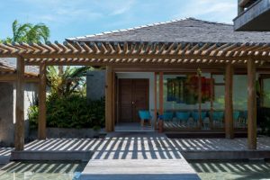 A combinação de elementos rústicos e tradicionais da Bahia, com soluções e detalhes modernos e práticos, somados à vista deslumbrante do mar, resultam em uma atmosfera alegre e envolvente. Tudo especialmente pensado com toques brasileiros, como o piso em cimento queimado na cor branco, os decks em madeira e piscina com acabamento que imita a areia da praia.