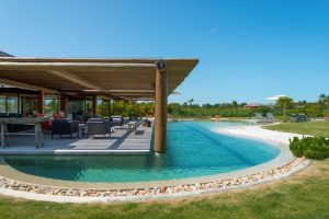 A casa localizada no litoral da Bahia, em Trancoso, possui 831,22m² de área construída em um terreno de 3.288m²