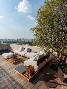 No pavimento íntimo ficou apenas a área de serviço, suítes, uma sala intima e uma copa para conforto imediato. No pavimento social, um grande estar dividido em dois ambientes, mais sala de jantar, lavabo, cozinha e um espaço gourmet com uma continuidade muito expressiva para a área de piscina. Já no pavimento do escritório temos também um lavabo e um sundeck com uma vista muito privilegiada para a copas das arvores do Jardim América e Europa.