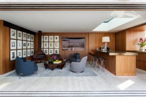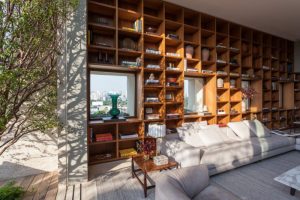 Uma das principais exigências do prédio era que prevalecesse as esquadrias de madeira que abriam com sistema sanfona, que para o conceito de David Bastos não eram adequadas e por isso foram restauradas todas as portas e janelas alterando o sistema para correr. No estar foi possível aproveitar estas janelas envolvendo-as nos nichos da estante, o que emoldurou a vista da marcenaria como se fossem quadros.