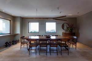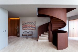 No pavimento inferior optaram por colocar um piso de madeira de demolição de canela retirado de uma fazenda antiga. Este material se destaca no pavimento todo. E para conseguir uma circulação vertical que não ocupasse muito espaço, a opção foi projetar uma escada circular – caracol, em aço corten, tornando-a um marco no projeto.