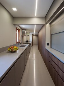 A cozinha longitudinal recebeu um passa-prato que a liga com a copa e posteriormente com a sala de jantar. Foi pensada não só para o dia-a-dia dando praticidade à família, como também para eventos. A bancada vira aparador apenas subindo a guilhotina, mas também para grandes eventos onde a funcionalidade para passar grandes travessas aumenta.