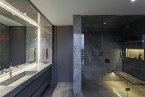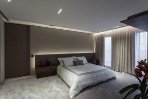 Os pavimentos superiores misturam revestimento de tecido almofadado das paredes com a lâmina da madeira Nogueira e um piso de travertino romano. Os mármores dos banheiros foram escolhidos tendo em conta gostos particulares dos clientes. Já os lavabos, gourmet e piscina receberam um mármore verde Guatemala que se destaca no projeto.