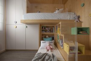Estrela do apartamento da família, o quarto das pequenas esbanja suavidade e alegria. Para a menina mais velha, de 3 anos, a cama com pegada montessoriana trouxe independência, pois pode brincar sem limites e com muita segurança. Para a bebê, a cama baixa e o restante dos móveis sob medida dão conta do recado. A marcenaria conduziu toda concepção e o tom claro da madeira atuou como pano de fundo para a combinação atemporal de rosa e azul.