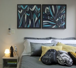O dono deste quarto é apaixonado pela saga Star Wars e isso reflete em toda a decoração. Uma das prioridades foi a cama de baixa altura, já que o menino é um grande amante de videogames. Nesse conjunto, os arquitetos pensaram na funcionalidade dos móveis para quando o garoto estivesse aproveitando seus games favoritos e, por isso criaram uma iluminação especial sob o tablado, permitindo que ele jogue confortavelmente com as luzes apagadas. “Na nossa primeira conversa, ele deixou muito claro suas paixões e o que esperava para o ambiente”, afirma Renato Andrade.