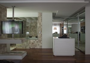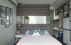 Apaixonada pelo mundo da moda e maquiagem, atrás da cama o projeto posicionou o closet. Para a penteadeira, o escritório buscou inspiração na cenografia dos camarins, combinando a iluminação ideal para as makes da moradora. “A ideia foi desenvolver um projeto urbano e feminino, já que nos encantamos pela personalidade da cliente“, finaliza Erika.
