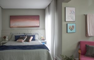 No briefing com o casal, duas prerrogativas: máximo conforto e a presença do rosa, cor favorita da moradora. Os profissionais investiram na tendência do monocromático ao escolherem um tom para as paredes e outro para a cabeceira.