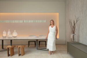 A escolha por elementos naturais também foi um ponto central na concepção do projeto. Um exemplo marcante são as mesas Paloh, que trazem tampos em pedra mineral, enfatizando a conexão com a natureza — um dos pilares do trabalho de Caroline Bollmann.