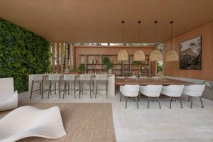 As peças chaves do espaço são mesa/coluna de Jantar OAK e a poltrona Banyan II assinadas pelo Estúdio Artefacto, além dos produtos como Poltrona Vic do Piegatto e a estante Jeri assinada por Roberto Cimino e Nelson Amorim. Todas as peças são da Artefacto Beach & Country.