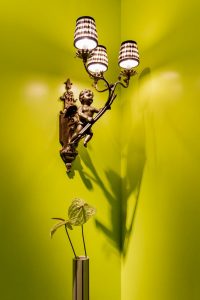 O projeto luminotécnico protagoniza a luz quente e cria uma atmosfera intimista. Idealizada em conjunto com o light designer Bender Barbosa e a Alma Light, a iluminação técnica reproduz o efeito de “luz de velas”. Peças icônicas como a luminária Snoopy, da italiana Flos, se misturam a itens garimpados de outras décadas, como a arandela em formato de anjo, do lavabo.