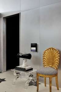 Design e arte reverberam a pluralidade de referências da curadoria criada pelo arquiteto em uma base de linhas retas e puras. Obras artísticas em tom lúdico e questionador estimulam um mix de sensações. Assinadas por nomes como Marcelo Conrado, Sonia Menna Barreto e Bruno Marcelino, da galeria Zilda Fraletti contrastam com diferentes peças de mobiliário – contemporâneas e algumas vintage. As cadeiras de Serge Roche refletem o savoir faire de Mike Álvares e, junto com o espelho império, fazem contraponto com as linhas limpas de base, com a irreverência da poltrona inflável da Melissa e com a artesania de peças em fibras naturais. Móveis consagrados com desenho Parsons como mesas de apoio e centro, além de chaises de contornos puros, dão linearidade e remetem à nuance contemporânea, assim como o tapete reloaded, com tingimento que esmaece sua estampa.