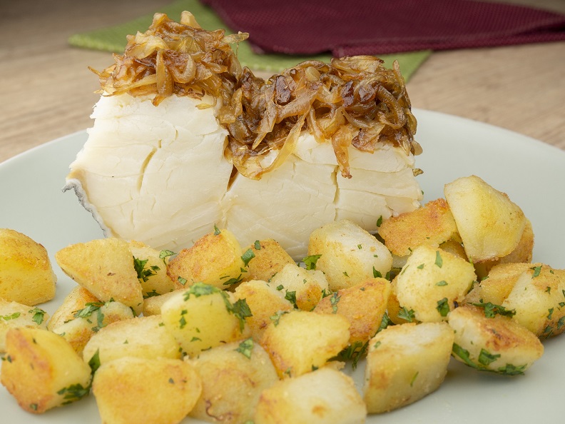 Bacalhau da Noruega com cebola caramelizada e batata sauté
