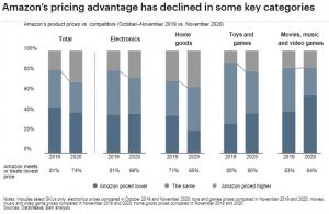 - Seu desempenho de preços é pior em categorias como produtos domésticos, que dependem mais fortemente das vendas de terceiros, dando à Amazon menos capacidade de influenciar os preços por algoritmos. Enquanto a Amazon rapidamente se esforçava para remover os vendedores culpados de preços abusivos em produtos essenciais nos primeiros meses da pandemia, suas vantagens de preço caíram mesmo em categorias não essenciais.