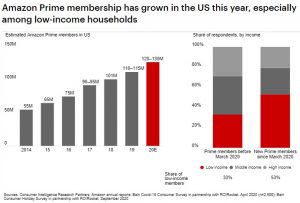 - Os mais novos membros Prime da Amazon são muito mais propensos a ter renda mais baixa, um segmento que o Prime não havia efetivamente penetrado antes. De acordo com uma pesquisa da Bain, a maioria dos novos membros Prime que se inscreveram durante a pandemia viram um valor agregado na oferta. Eles citaram o desejo de ter entregas mais rápidas, preços mais baixos e serviços adicionais, como Prime Video e Amazon Music, como os principais motivos para aderir.