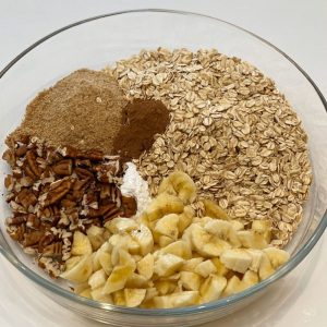 Modo de preparo: Pré-aqueça o forno em 180° graus. Coloque em um recipiente a banana, aveia, nozes, canela, linhaça, fermento. Bata no liquidificador por 4 minutos o leite com óleo de coco, açúcar de coco, extrato de baunilha. Misture o líquido com os secos, a massa fica firme e compacta. Coloque em uma forma untada e asse por 30 minutos.