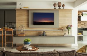 Para maior integração no projeto, Karina Korn integrou a bancada da cozinha ao painel da TV, criando um elegante design contínuo | Fotos: Luis Gomes
