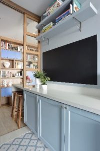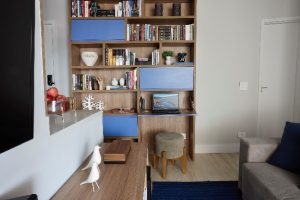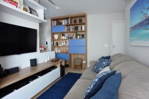 Cada vez mais usual na atualidade, o apê ainda precisa contar com um espaço de home office. Entusiasta da marcenaria, a profissional projetou um móvel multifuncional: além de acomodar o acervo de livros, uma porta suspensa transforma-se em apoio para utilizar o notebook. O perfil discreto da família foi refletido no décor da área social, que apresenta uma base neutra pontuada com azul no mobiliário e acessórios, como o tapete, que criou o aconchego para os dias da família unida para ver um bom filme.