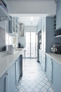 Para a cozinha, os moradores trouxeram para Carina uma foto de referência de um dos projetos executados por ela. Apaixonados por cozinha – sem dúvidas, o ambiente favorito deles –, e a cor azul, os armários revelam um tom mais delicado que promove sintonia com o ladrilho hidráulico do piso. A bancada de quartztone é prática e se alinha com a proposta do ambiente. Os eletros embutidos no mobiliário criam um espaço maior de circulação no ambiente. A arquiteta também propôs um espaço para uma lousa para as anotações importantes e as prateleiras superiores receberam os livros de culinária que a moradora coleciona.