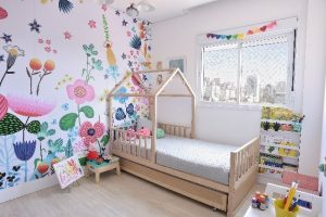 Para o dormitório dafilha mais velha, o adesivo reproduz a alegria da natureza e suas diversas espécies de flores e cores. A cama, com estrutura de casinha, transmite proteção para a menina, além de reforçar o clima lúdico do quarto. “Um cantinho para os livros também era essencial”, explica Carina.