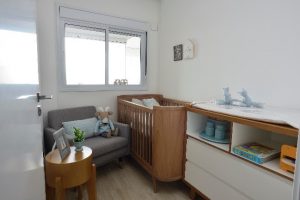 Conforto e delicadeza são coisas que não faltam no ambiente dedicado ao recém-nascido. A cômoda foi eleita como apoio para o trocador e adornos. O berço de madeira é uma peça coringa para o ambiente, já que é neutro e atemporal. A poltrona foi um elemento pra lá de importante na composição, pois é o ponto de conexão onde a mamãe terá os seus momentos de amamentação com o bebê. “A sutiliza permeia por cada cantinho deste quarto”, define Carina.