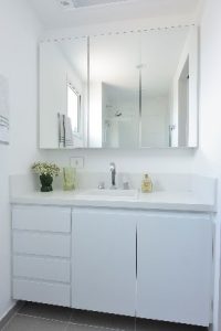 O casal solicitou que o lavabo oferecesse um estilo mais sofisticado. O resultado foi obtido por meio da especificação dos acabamentos, como as pastilhas na parede do espelho e a iluminação. O banheiro dos moradores segue o estilo clean com paredes, móveis e louças na cor branca.