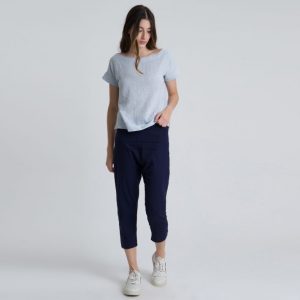 Conjuntos de alfaiataria casual em linho e algodão. Vestidos com silhueta solta no corpo. Cintura mais baixa, camisas, blusas de seda, quimonos e calças saruel. Produção artesanal e sustentável Brasil – Índia.