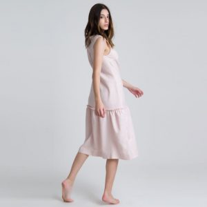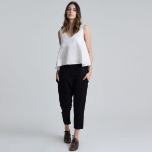 Conjuntos de alfaiataria casual em linho e algodão. Vestidos com silhueta solta no corpo. Cintura mais baixa, camisas, blusas de seda, quimonos e calças saruel. Produção artesanal e sustentável Brasil – Índia.