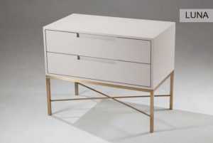Móvel de cabeceira Luna com duas gavetas e pés metálicos garantem sofisticação e espaço de armazenamento.