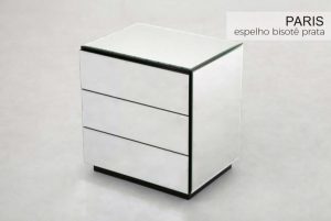 Com três gavetas, o móvel de cabeceira Paris tem acabamento em espelho bisotê que pode ser em prata ou em bronze.