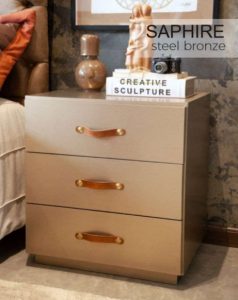 Móvel de cabeceira Saphire, com puxadores em couro, que é tendência na decoração de interiores.