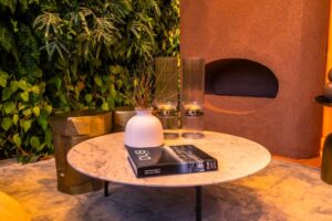Especialistas em neurodesign – área que estuda e aplica projetos com base em emoções, bem-estar e felicidade – elas projetaram o ambiente com foco em contemplação, conexão e participação das pessoas. O projeto nasceu a partir da árvore que estava no terreno e foi mantida e aproveitada de maneira inusitada. Parte do seu tronco está iluminado e exposto por meio de uma abertura de vidro para que os visitantes possam ver. A outra parte integra o espaço, com flores e musgos e um movimento sinuoso que deve surpreender quem passa por lá. Outro destaque é a parede verde, que traz uma sensação de bem-estar e complementa a proposta biofílica.