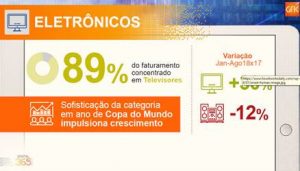 De janeiro a agosto deste ano, as vendas do setor cresceram 8%, muito puxadas pelo desempenho de TV’s (crescimento de 30% de janeiro a agosto de 2018 ante 2017) no primeiro semestre, ano de Copa de Mundo.