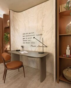 Para materializar a proposta, os móveis da Artefacto tiveram papel essencial. Acabamentos em couro natural e peças de design orgânico contribuem para a fluidez da narrativa espacial. Texturas, paleta cromática e iluminação foram cuidadosamente escolhidos para transmitir acolhimento, tranquilidade e descanso – criando um espaço íntimo, funcional e sensorialmente agradável. “Buscamos mais do que estética e funcionalidade. Nossa arquitetura revela-se na criação de espaços que acolhem histórias e encontros, sempre respeitando a identidade única de cada pessoa”, afirmam Marina e Thalita.