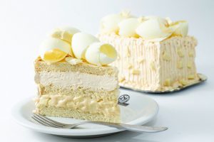 O Bolo Galak #115 é produzido com massa branca e tem recheios de trufas brancas com pedaços de chocolate branco e mousse branco, cobertura de mousse branco, raspas de chocolate branco e cerejas.