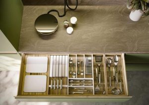 Organizzare Mescla une a elegância da madeira à tecnologia do Corian, um material tecnológico que evita a proliferação de bactérias ou fungos. As medidas podem ser personalizadas de acordo com o espaço interno das gavetas.