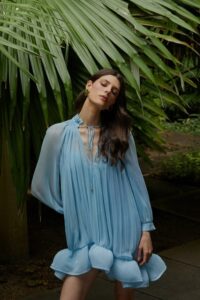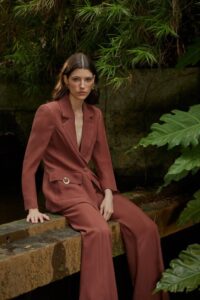 Composta por vestidos midi, mini e longos, macacões, blazers, calças, saias, topscroppeds, blusas e regatas, a coleção ganha força através dos conjuntos, com peças coordenadas que se destacam pelo caimento impecável e pela elegância atemporal. Os materiais escolhidos, como jersey, viscose, algodão, linho, denim e acetato, garantem leveza e movimento, enquanto organza rústica, rendas, laises e guipures agregam um toque artesanal às composições.