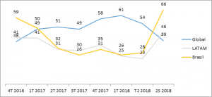 A queda no índice de otimismo global é impulsionada pela incerteza econômica, com um pico de 50%, um aumento de 22% em relação ao segundo trimestre de 2018. Esse aumento pode ser parcialmente atribuído a tensões geopolíticas como a guerra comercial entre EUA e a China. Apesar da desaceleração do crescimento do PIB para muitas economias avançadas, as emergentes Ásia Pacifica e a América Latina, em geral, vêm resistindo a essas incertezas.