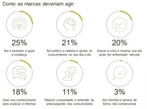 Mesmo nesse momento tão delicado, o consumidor brasileiro diz que quer ouvir o que as marcas estão fazendo e como podem contribuir para melhorar essa situação, uma vez que as marcas também podem ser agentes de mudança e exemplo para seus consumidores.