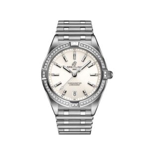 Chronomat Automatic 32: Mais um modelo com a pulseira “Rouleaux” da Breitling e fecho borboleta, o Chronomat 32 é alimentado pelo Breitling Calibre 77, um cronômetro SuperQuartz™ certificado pelo COSC. Caixa em aço inoxidável cravejado de diamantes.