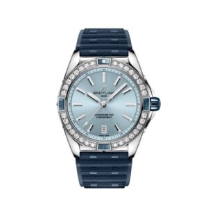Super Chronomat Automatic 38 Apresenta caixa em aço inoxidável e pulseira de borracha azul. Diamantes grandes cultivados em laboratório completa o bisel de aço inoxidável. As cores do mostrador são um detalhe a parte.