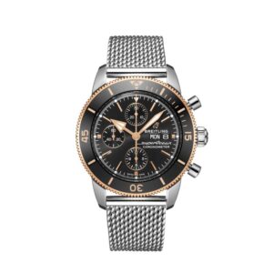 Inspirado no Superocean original da década de 1950, o Superocean Heritage combina características de design icônicas com um toque moderno. Esportivo e elegante, o Superocean Heritage é uma verdadeira personificação do estilo no mar. Apresentando os icônicos ponteiros triangulares, bem como uma luneta unidirecional com um anel de cerâmica polida, o Superocean Heritage é um relógio de mergulho de aparência elegante. Caixa em aço inoxidável com ouro vermelho 18k, este Superocean Heritage é alimentado pelo Breitling Calibre 13, um cronômetro certificado pelo COSC.
