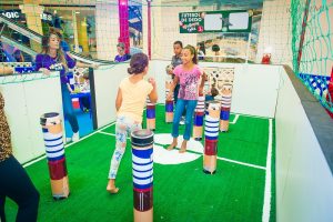 No Brinquedoteka: um Mega Futebol de Pinos, no qual os jogadores se colocam dentro do campo e usam os pés para lançar uma bola de verdade na direção do gol adversário. O futebol de pino pode ser jogado em duplas.