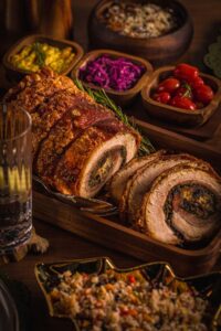 O Peru Assado (R$160/kg) volta como escolha certeira para quem deseja uma proteína protagonista. A ave é marinada por 24 horas e assada lentamente no forno de pedra, resultando em carne macia, douramento impecável e aroma que anuncia a noite especial que está por vir. A Porchetta (R$280/kg) segue como uma das receitas mais admiradas da Brød, com pururuca perfeita após seis horas de forno e recheio de farofa com bacon, damascos e uvas-passas.