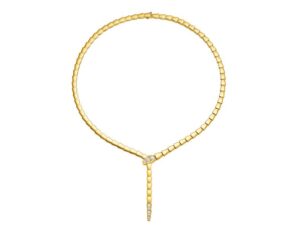 Em ouro amarelo, tom precioso profundamente entrelaçado com o legado da marca, a coleção revela um brilho intenso e um apelo contemporâneo. Um colar com um pingente de serpente em miniatura elegantemente entrelaçado na corrente incorpora as curvas refinadas da criatura, enquanto um colar moderno traduz o movimento flexível e sinuoso do animal em uma linguagem geométrica irresistível e linhas fluidas. O design é finalizado com extremidades cravejadas em pavê de diamantes que amplificam seu brilho em um sutil jogo de luz. Completando o conjunto em ouro amarelo, um par de brincos longos evoca o mesmo movimento rítmico, com suas cabeças e caudas cravejadas de diamantes cintilando a cada movimento.